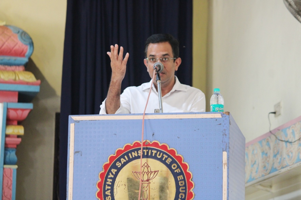 Address by Sri Anand Velu, Sr. Consultant, TCS, Disaster Management In-Charge, TN North, SSSSO, addressing the students on the topic: Rama, Krishna, Sai – 3 but 1