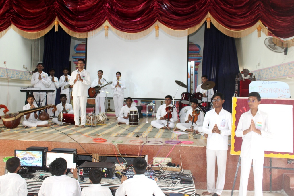 The programme continued with the prize distribution ceremony, where students received awards and certificates for their achievements in various external competitions. The special award presented by Eldrok India, in recognition of the school’s adoption of cutting-edge technological innovations in the field of education, was proudly received by Correspondent Sri S. Loganathan and the school heads. The Chief Guest personally handed out the accolades, filling the students with pride and enthusiasm. The grand celebration concluded with a heartfelt vote of thanks by Principal In-Charge, Ms. N.Vedhanayagi, followed by the offering of Mangala Arathi to Bhagawan. All attendees received the special Independence Day Prasadam at the end of the celebration.