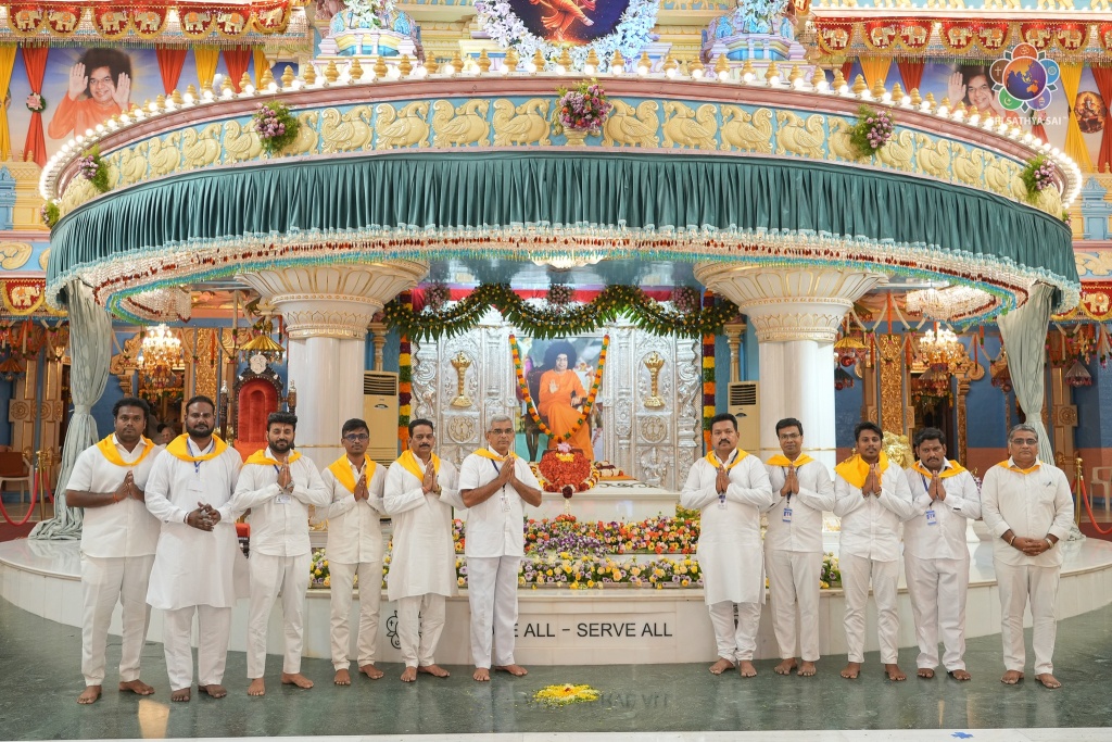 The students, staff, and management of SSSIE were blessed to have a group photograph taken in front of Bhagawan’s Mahasamadhi—a moment etched in their hearts forever. Sri R.J. Rathnakar Garu, Managing Trustee of the Sri Sathya Sai Central Trust, and Sri Chakravarthi Garu, IAS (Retd.), Chairman, Sri Sathya Sai Global Council, lovingly presented a memento to each student who offered the drama presentation at the lotus feet of Bhagawan.